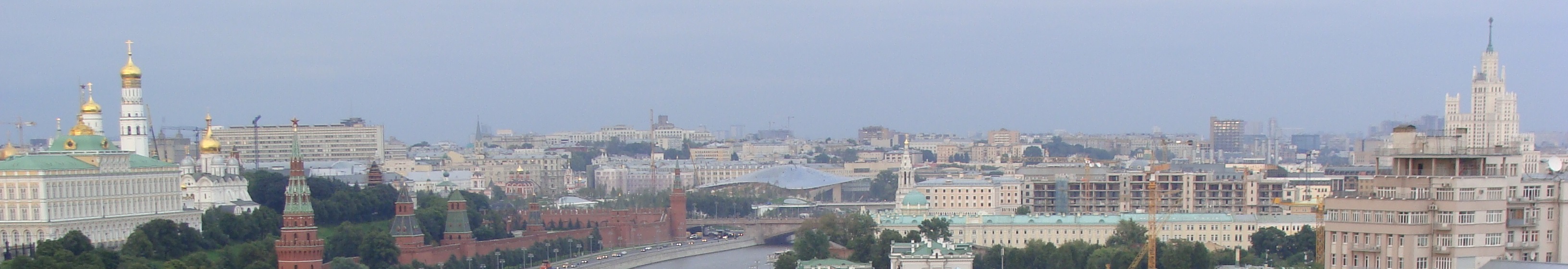 Au-delà du pont Bolchoï Kamenny, le Kremlin ; à l'horizon tout à droite, l'immeuble d'habitation de la berge Kotelnitcheskaïa ; au premier plan, l'un des kokochniks de la Cathédrale du Christ-Sauveur |